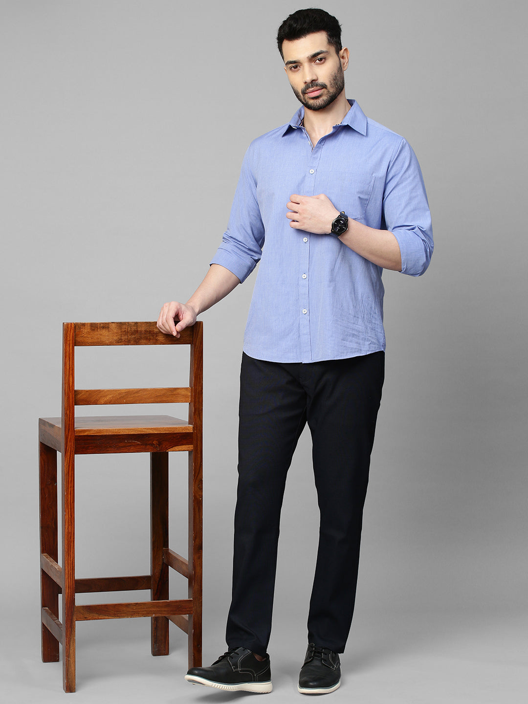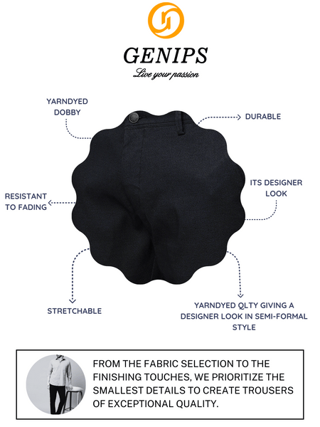 This Men's Black Trousers from Genips is designed intricate self-texture. Made out of Cotton Stretch fabric ensuring comfort, breathability, and excellent stretchability all day. Offers a Mid Rise waist with a Slim Fit and a flat front for a sleek look that has been elevated with a Self Design pattern. Features pockets, zipper, and button for closure. Match it with a T-shirt of your choice and a pair of canvas for an iconic look. Perfect for casual looks.