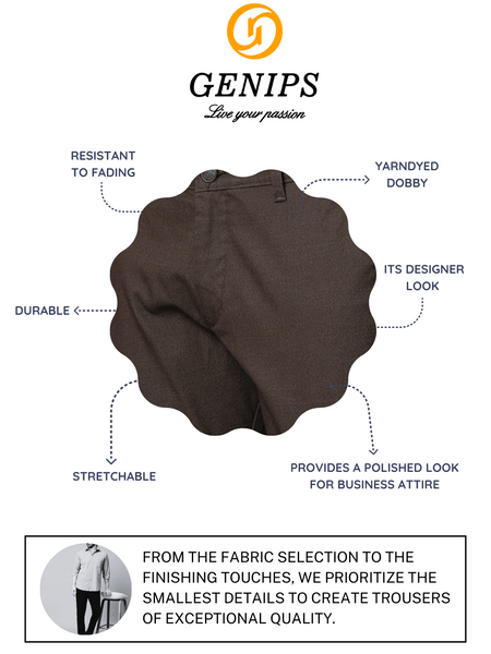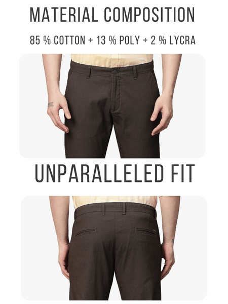 This Men's Black Olive Trousers from Genips has a retro vibe to it. Made out of Cotton Stretch fabric ensuring comfort, breathability, and excellent stretchability all day. Offers a Mid Rise waist with a Slim Fit and a flat front for a sleek look that has been elevated with a Self Design pattern. Features pockets, zipper, and button for closure. Match it with a T-shirt of your choice and a pair of canvas for an iconic look. Perfect for casual looks.