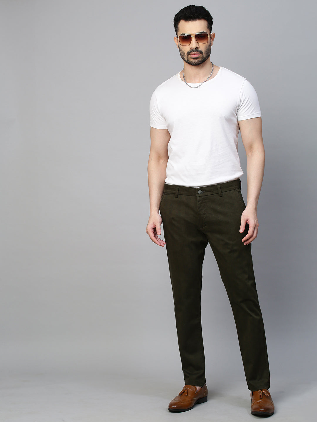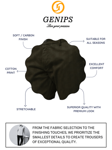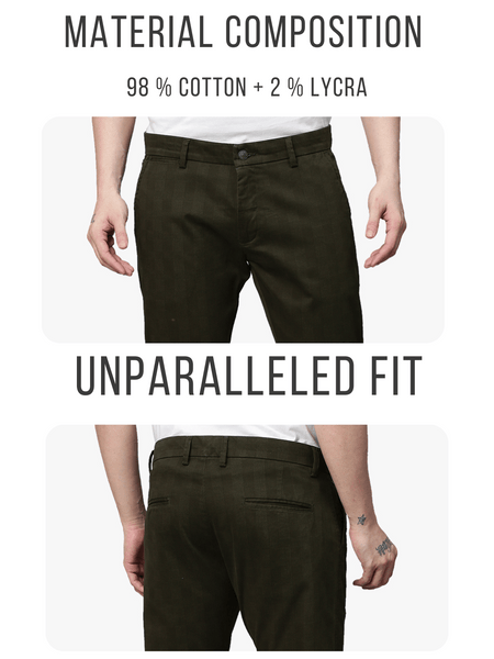 This Men's Bottle Green Trousers from Genips is designed to fit perfectly. Made out of Cotton Stretch fabric ensuring comfort, breathability, and excellent stretchability all day. Offers a Mid Rise waist with a Slim Fit and a flat front for a sleek look that has been elevated with a Print pattern. Features pockets, zipper, and button for closure. Match it with a T-shirt of your choice and a pair of canvas for an iconic look. Perfect for casual looks