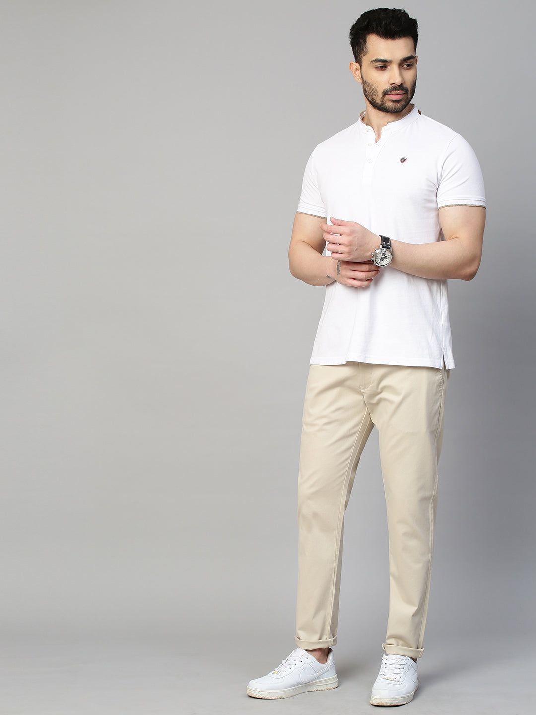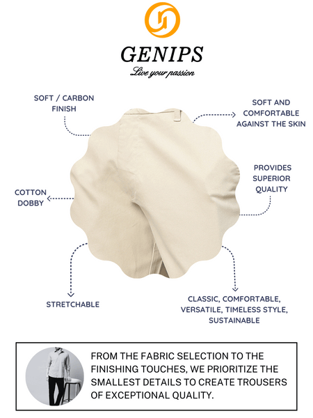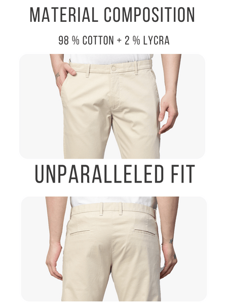 This Men's Cream Trousers from Genips will suit with white t-shirt. Made out of Cotton Stretch fabric ensuring comfort, breathability, and excellent stretchability all day. Offers a Mid Rise waist with a Slim Fit and a flat front for a sleek look that has been elevated with a Solid pattern. Features pockets, zipper, and button for closure. Match it with a T-shirt of your choice and a pair of canvas for an iconic look. Perfect for casual looks.