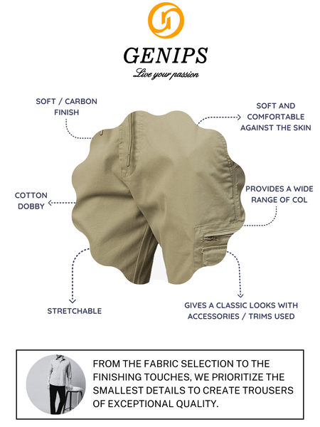 This Men's Green Cargo from Genips made of Bahamas fit. Made out of Cotton Stretch fabric ensuring comfort, breathability, and excellent stretchability all day. Offers a Mid Rise waist with a cargo Fit and a flat front for a sleek look that has been elevated with a Solid pattern. Features pockets, zipper, and button & drawstring for closure. Match it with a T-shirt of your choice and a pair of canvas for an iconic look. Perfect for casual looks.