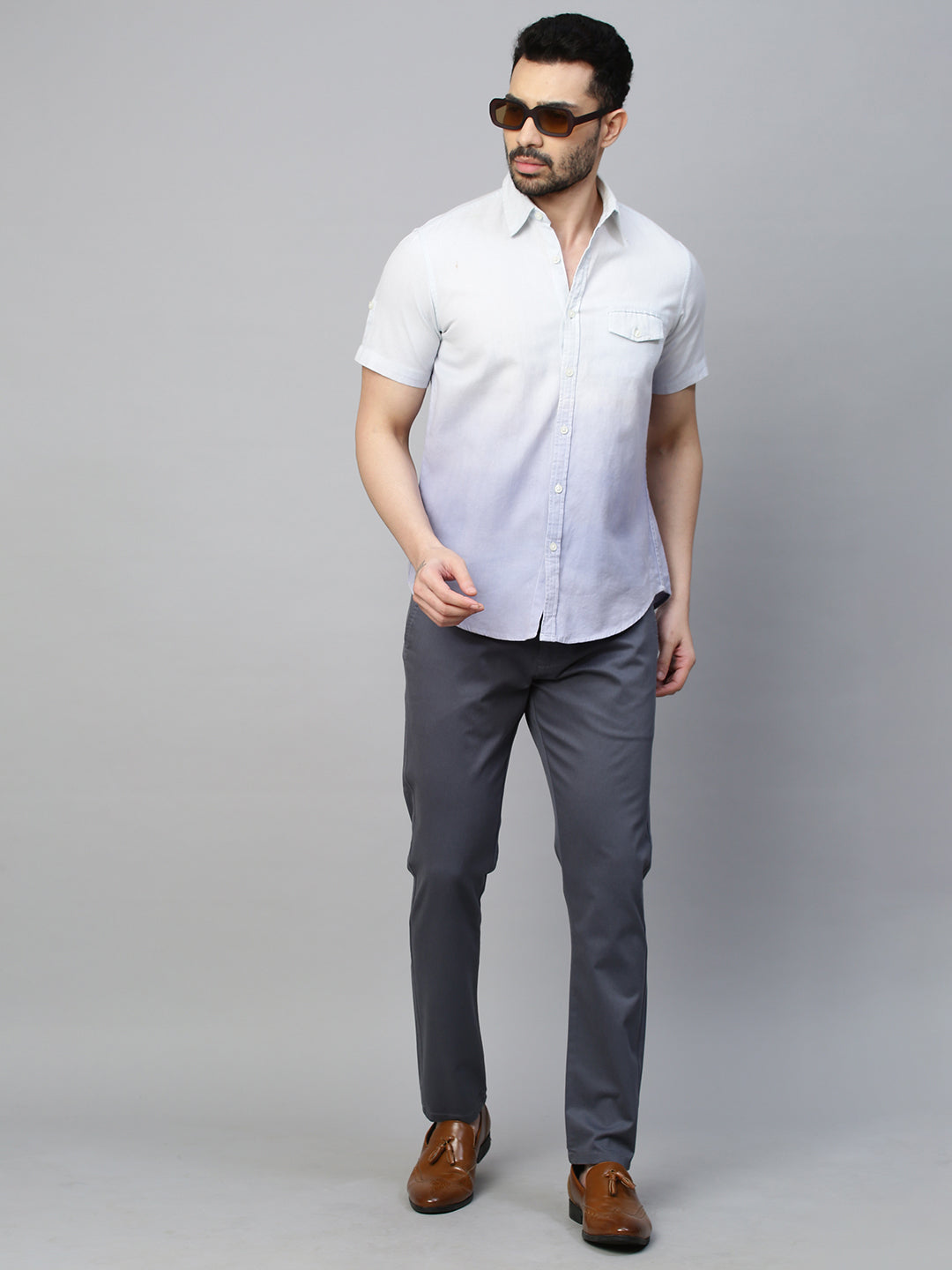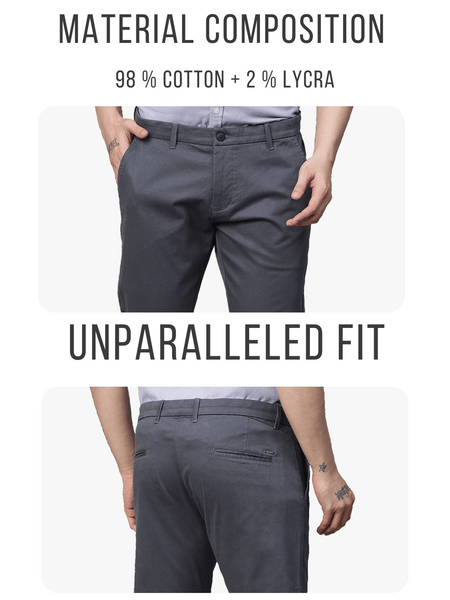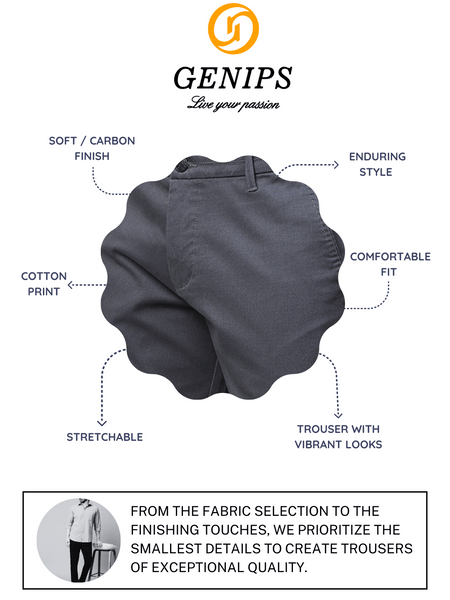 This Men's Grey Blue Trousers from Genips is crafted with high end textured fabric. Made out of Cotton Stretch fabric ensuring comfort, breathability, and excellent stretchability all day. Offers a Mid Rise waist with a Slim Fit and a flat front for a sleek look that has been elevated with a Self Design pattern. Features pockets, zipper, and button for closure. Match it with a T-shirt of your choice and a pair of canvas for an iconic look. Perfect for casual looks.