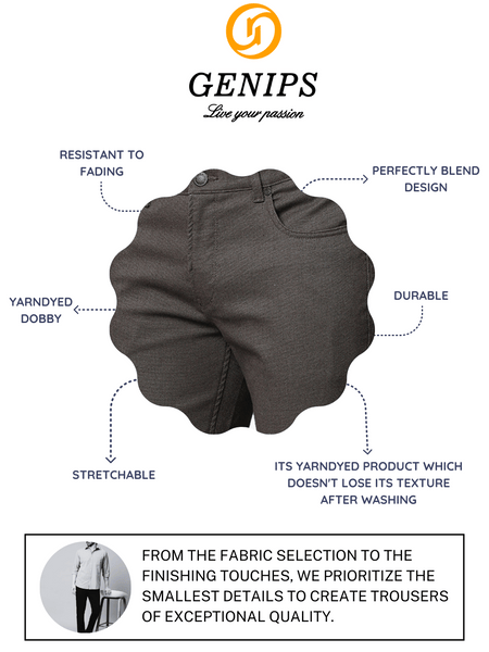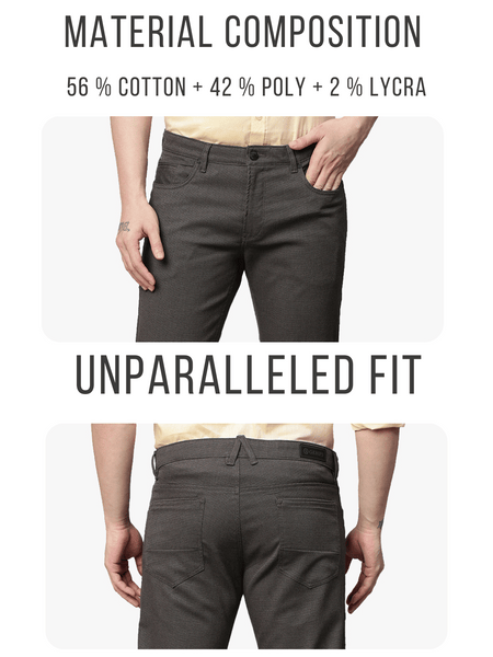 Add this unique Men's Grey Chinos from Genips is designed with beautiful texture. Made out of Cotton Stretch fabric ensuring comfort, breathability, and excellent stretchability all day. Offers a Mid Rise waist with a Slim Fit and a flat front for a sleek look that has been elevated with a Self Design pattern. Features pockets, zipper, and button for closure. Match it with a T-shirt of your choice and a pair of canvas for an iconic look. Perfect for casual looks.