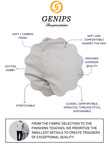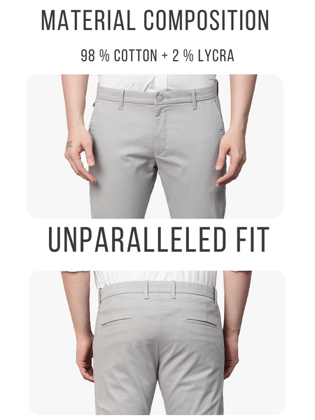 This Men's Light Grey Trousers from Genips will look good with mandarin shirts. Made out of Cotton Stretch fabric ensuring comfort, breathability, and excellent stretchability all day. Offers a Mid Rise waist with a Slim Fit and a flat front for a sleek look that has been elevated with a Solid pattern. Features pockets, zipper, and button for closure. Match it with a T-shirt of your choice and a pair of canvas for an iconic look. Perfect for casual looks.