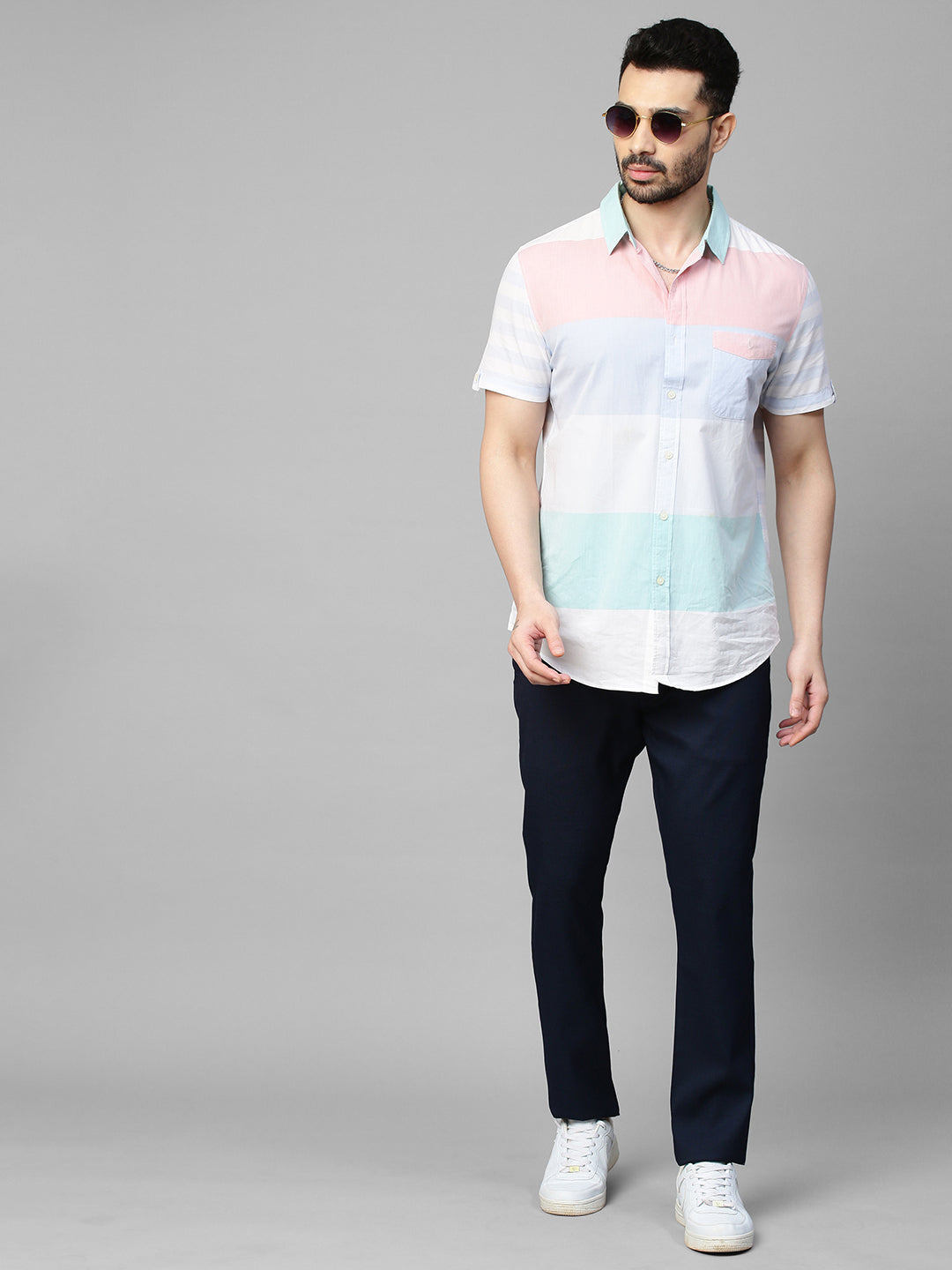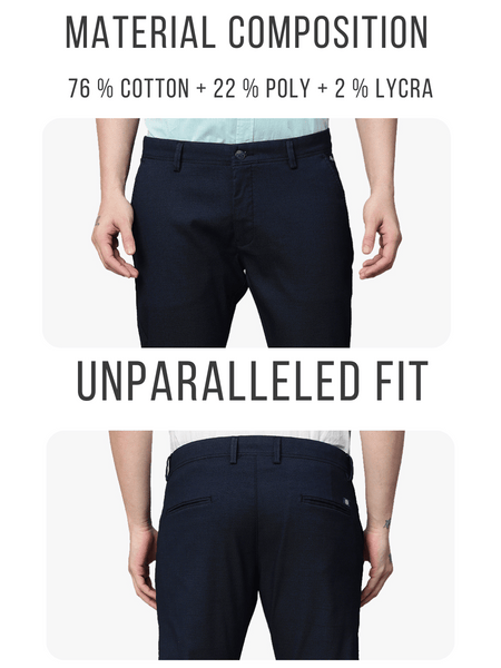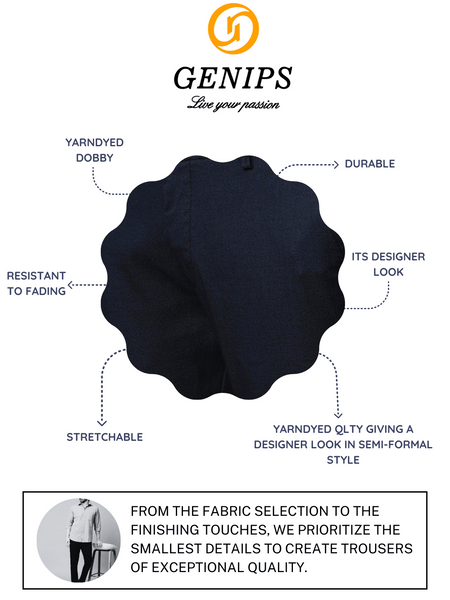 This Men's Navy Trousers from Genips is perfect for your meetings . Made out of Cotton Stretch fabric ensuring comfort, breathability, and excellent stretchability all day. Offers a Mid Rise waist with a Slim Fit and a flat front for a sleek look that has been elevated with a Self Design pattern. Features pockets, zipper, and button for closure. Match it with a T-shirt of your choice and a pair of canvas for an iconic look. Perfect for casual looks.