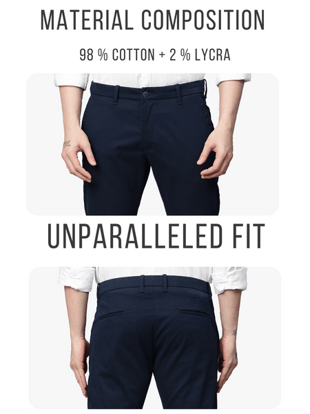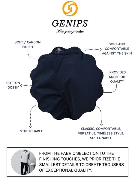 This Men's Navy Trousers from Genips define modernity. Made out of Cotton Stretch fabric ensuring comfort, breathability, and excellent stretchability all day. Offers a Mid Rise waist with a Slim Fit and a flat front for a sleek look that has been elevated with a Solid pattern. Features pockets, zipper, and button for closure. Match it with a T-shirt of your choice and a pair of canvas for an iconic look. Perfect for casual looks.